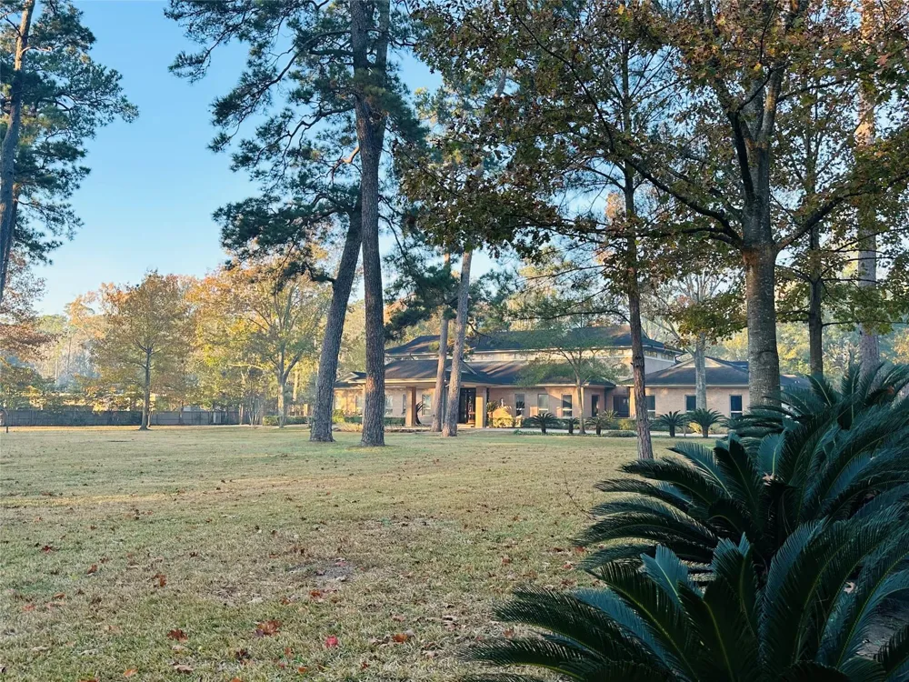Nestled on a serene 2.4-acre lot along a private street in prestigious Hunters Creek Village, this custom single-story estate offers exceptional privacy and ample space for entertaining. A private driveway winds through extensive gardens and mature trees, welcoming you to the porte-cochere entrance. The sunlit foyer opens to an impressive living room with soaring ceilings and expansive windows that flood the space with natural light. The thoughtfully designed floor plan features 4 bedrooms, 4.5 baths, 20' ceilings, a spacious family room, an elegant formal dining room, and a large kitchen with breakfast room overlooking wooded views. The primary suite boasts backyard vistas, a spa-like bathroom, and an oversized walk-in closet. An adjacent home office features an octagonal ceiling and a cozy fireplace. Outdoors includes lush landscaping, long driveways, a tennis/2-pickleball combo court, space for a future pool, and a 4-car garage. The property benefits from 24/7 private street patrol.